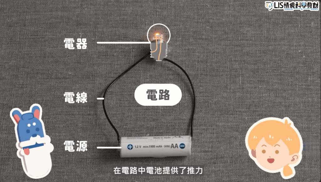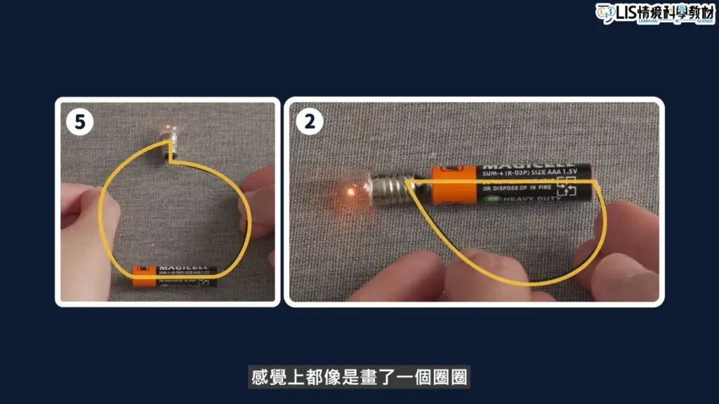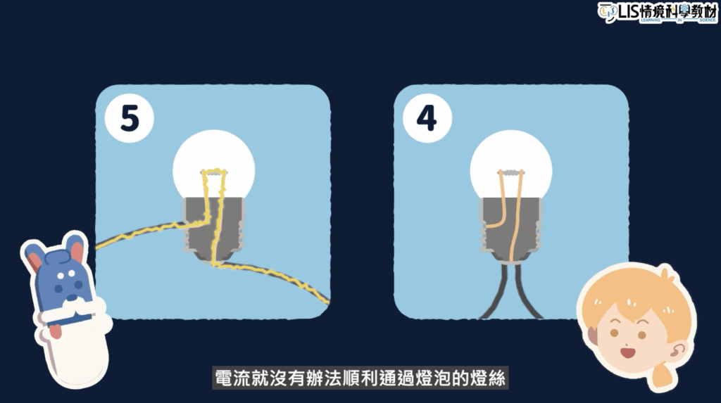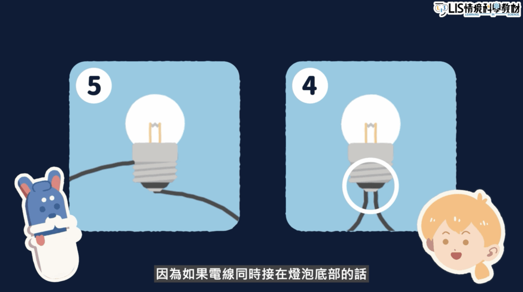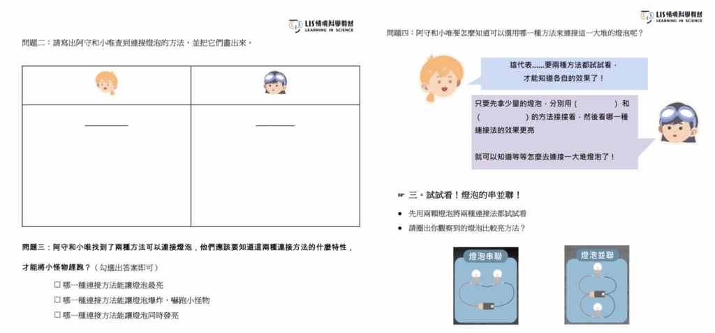 「實驗」作為解決問題的鷹架:影片會提供聯想與引導操作,當主角的智囊團,同時也讓這些線索引導正在看影片的孩子們。播放時可以不使用實驗段落的影片,直接在課堂上讓孩子們操作!觀察五種不同連結方式的結果,引導孩子說出自身的觀察與發現,進而歸納出「要連成完整的一個迴圈才能使燈泡發亮」、理解電路概念。此外,LIS也提供學習單,讓老師可以搭配教學簡報在課堂上使用,讓孩子思考課堂所學與複習,確認孩子的吸收狀況與理解。