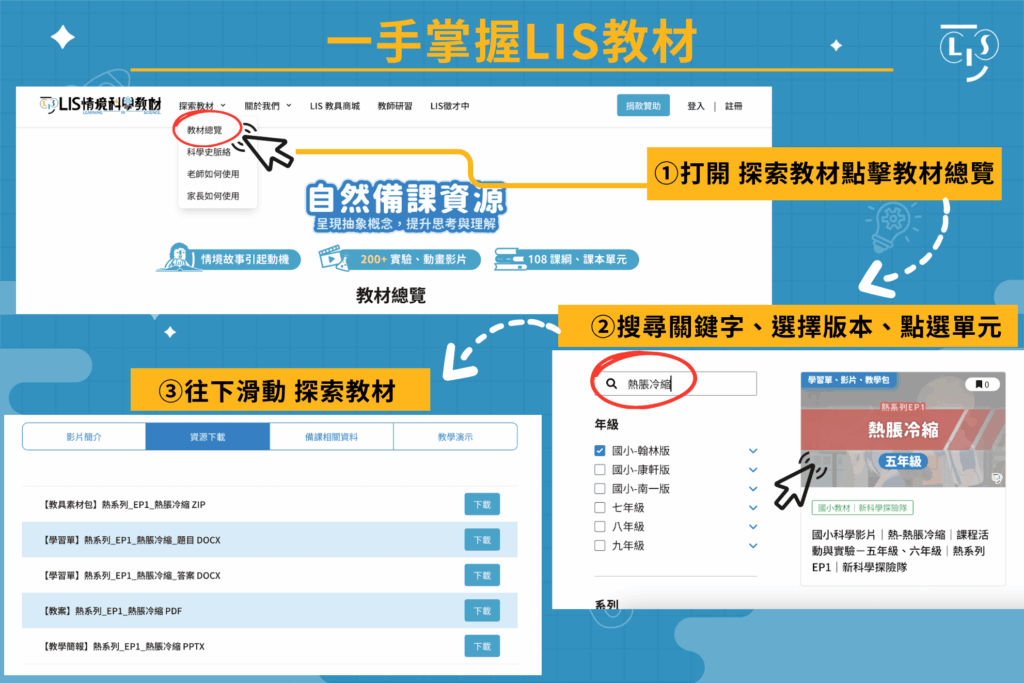 以前要開好幾個分頁找教材、下載學習單、看怎麼教,但上 LIS 官網已經幫我整理好所有教學資源,從影片教材、單元重點、學習單到備課簡報,一頁就能完整掌握一個單元的教學節奏與資源內容,真的很方便!——苗栗坪林國小許老師使用LIS教材後的回饋