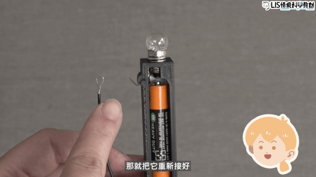 提出解決問題的假設:讓孩子根據剛剛學習到的電路概念,提出自己的假設,要怎麼解決「為什麼手電筒不亮?要怎麼讓手電筒發亮?」。最後再播放影片與孩子「對答案」,讓孩子們感受到自己與主角經歷了同樣的思考歷程、並且與主角一起成功的解決了問題!也可以使用與影片相同的手電筒,讓孩子實際「修復手電筒」,獲得滿滿的成就感!